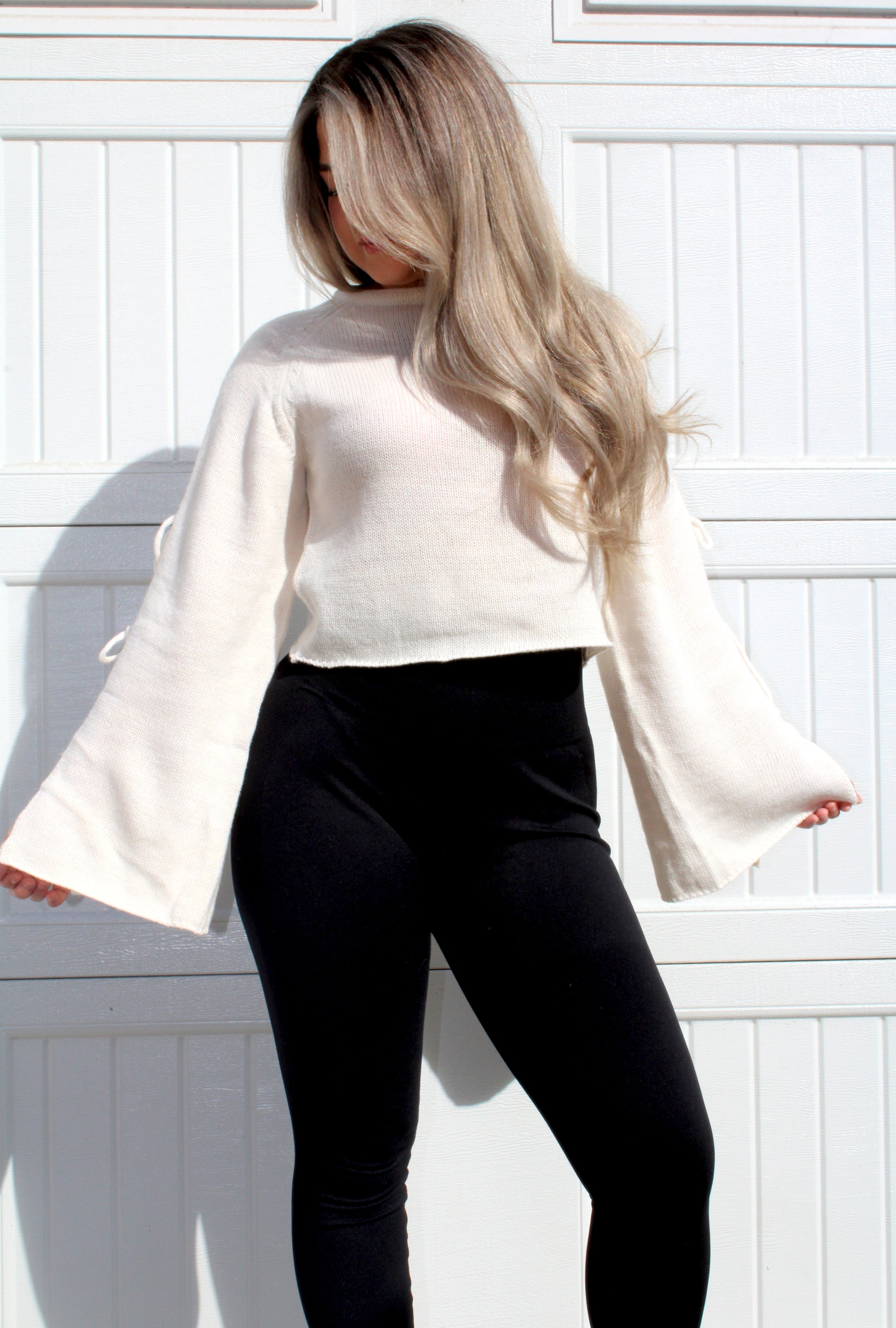 Add a feminine touch to your wardrobe with the Ella Knit Sweater. This cozy top features a delicate ribbon tie detail on the sleeves, adding a charming touch to your outfit. Perfect for staying warm and stylish on cooler days.