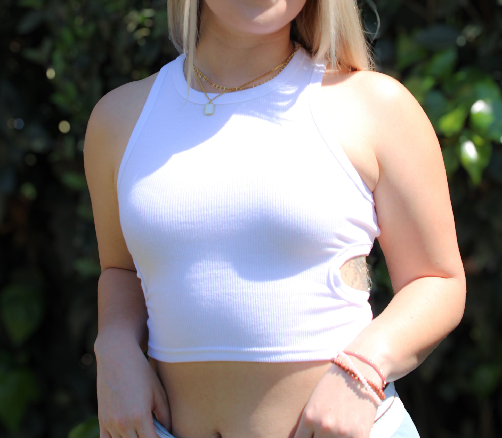 Rock your summer style with the Mila Cutout Tank. Featuring a trendy cutout design, this tank is available in classic white or edgy black. Perfect for any occasion, dress it up or down for a versatile and stylish look.