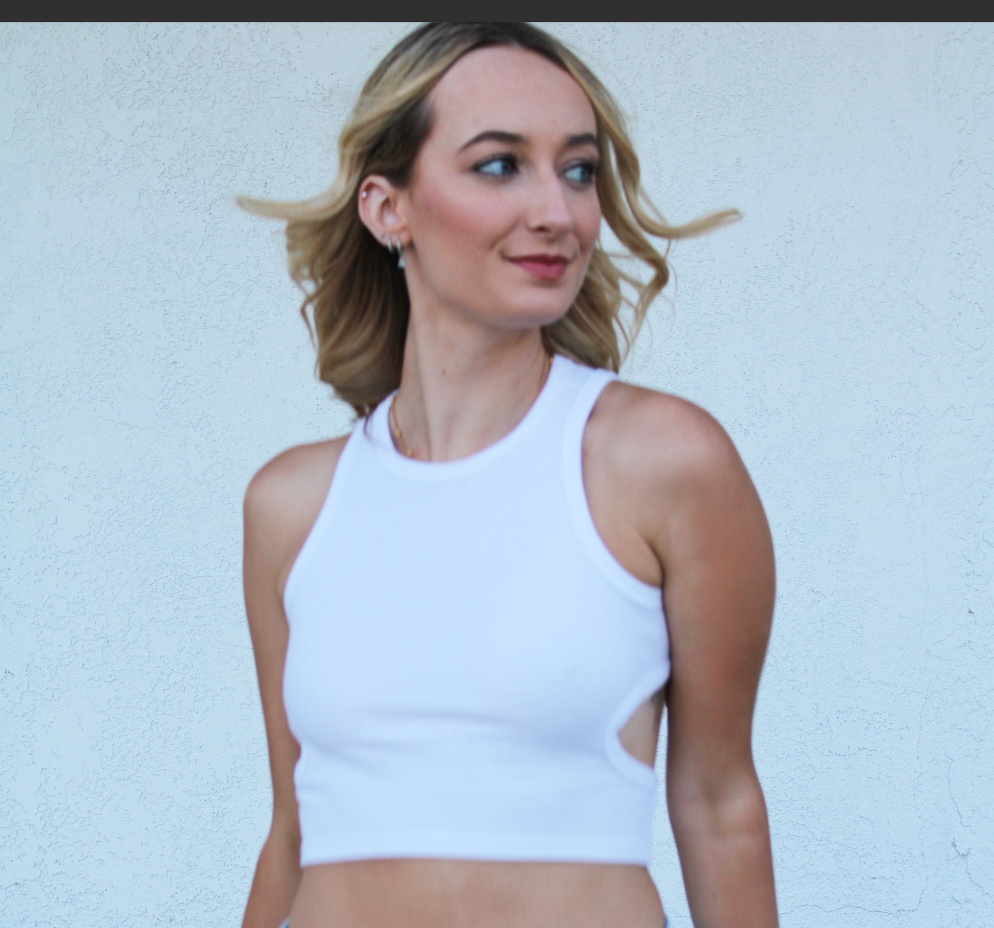The 'Mila' Cutout Tank ribbed cotton with side and back cutout detail.